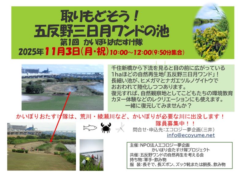まずは11月3日(月・祝)に行う荒川五反野三日月ワンドのかいぼり隊に応募してください。